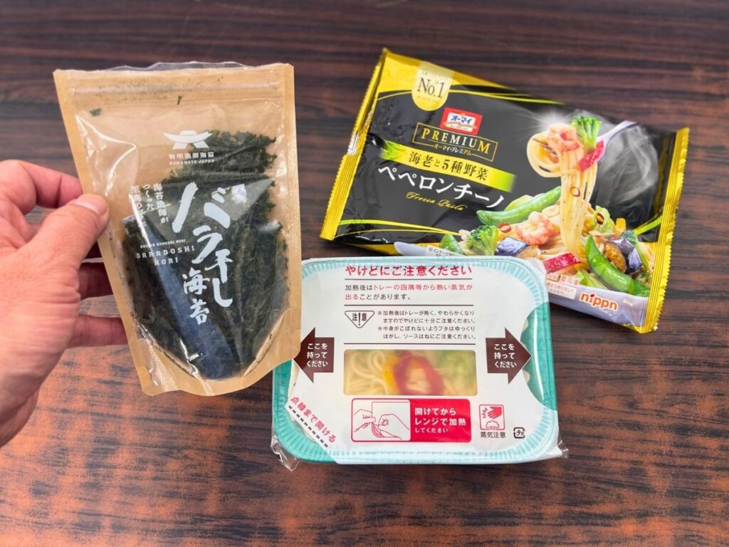 「冷凍食品」のペペロンチーノ+バラ干し海苔