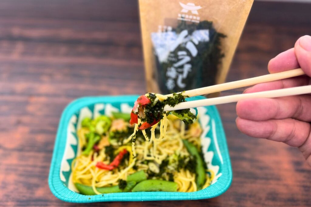バラ干し海苔を袋からひとつまみ振りかけるだけで調理は完了します。