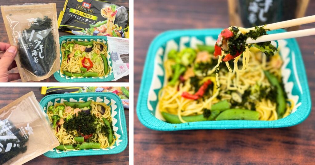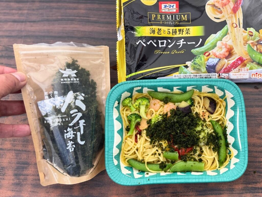 オーマイプレミアムの冷凍ペペロンチーノにバラ干し海苔を乗せてみました。