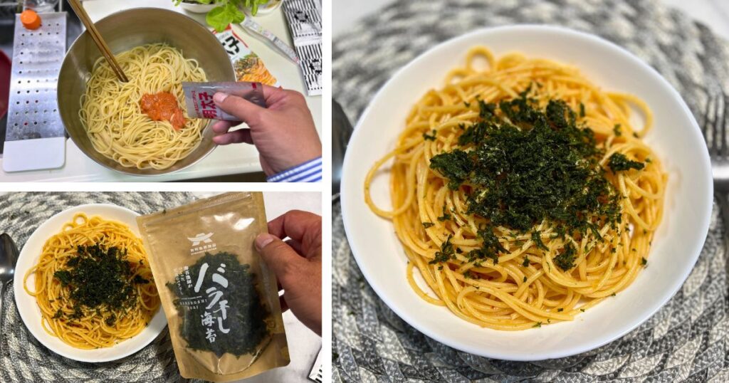 「あえるだけ」の明太子パスタ+バラ干し海苔
