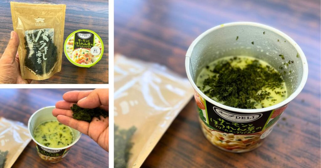 「お湯を注ぐだけ」のスープパスタにもバラ干し海苔を乗せてみました。